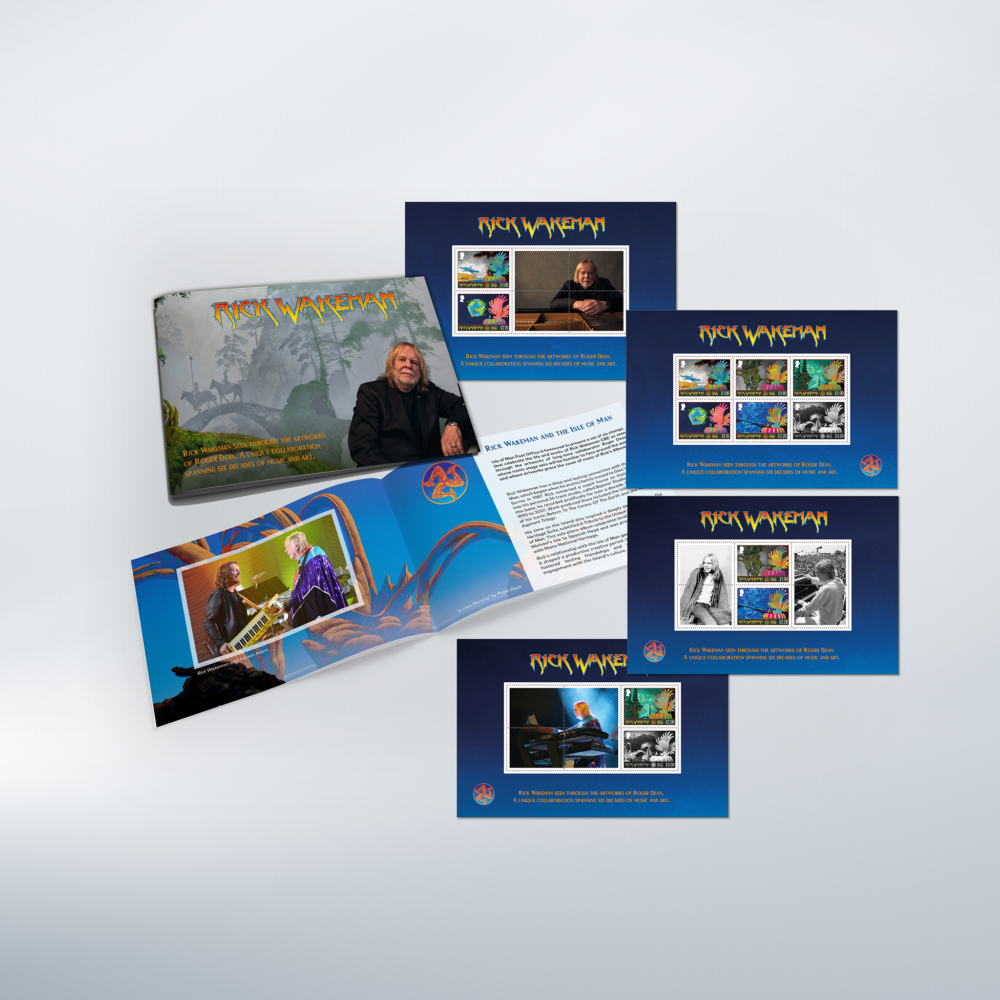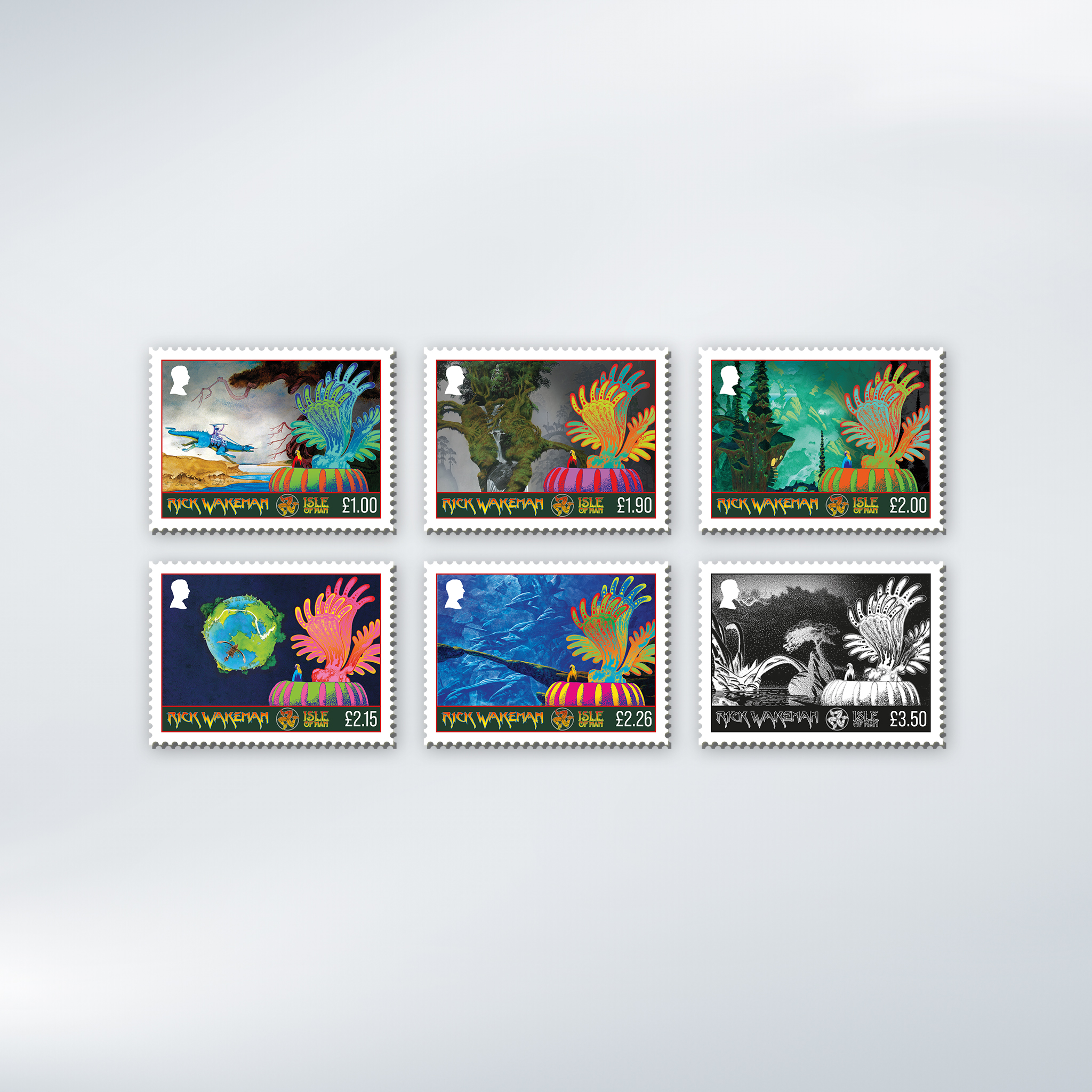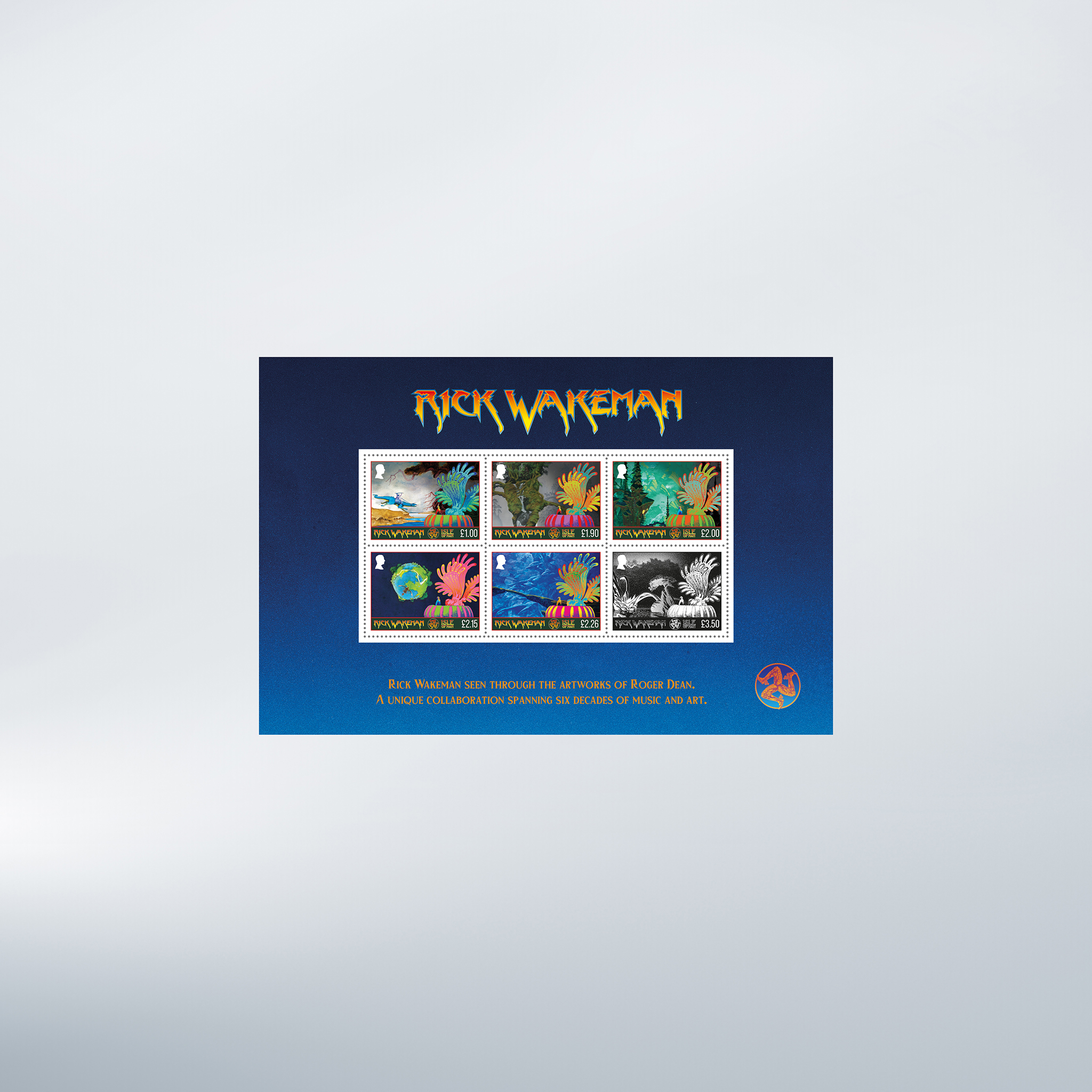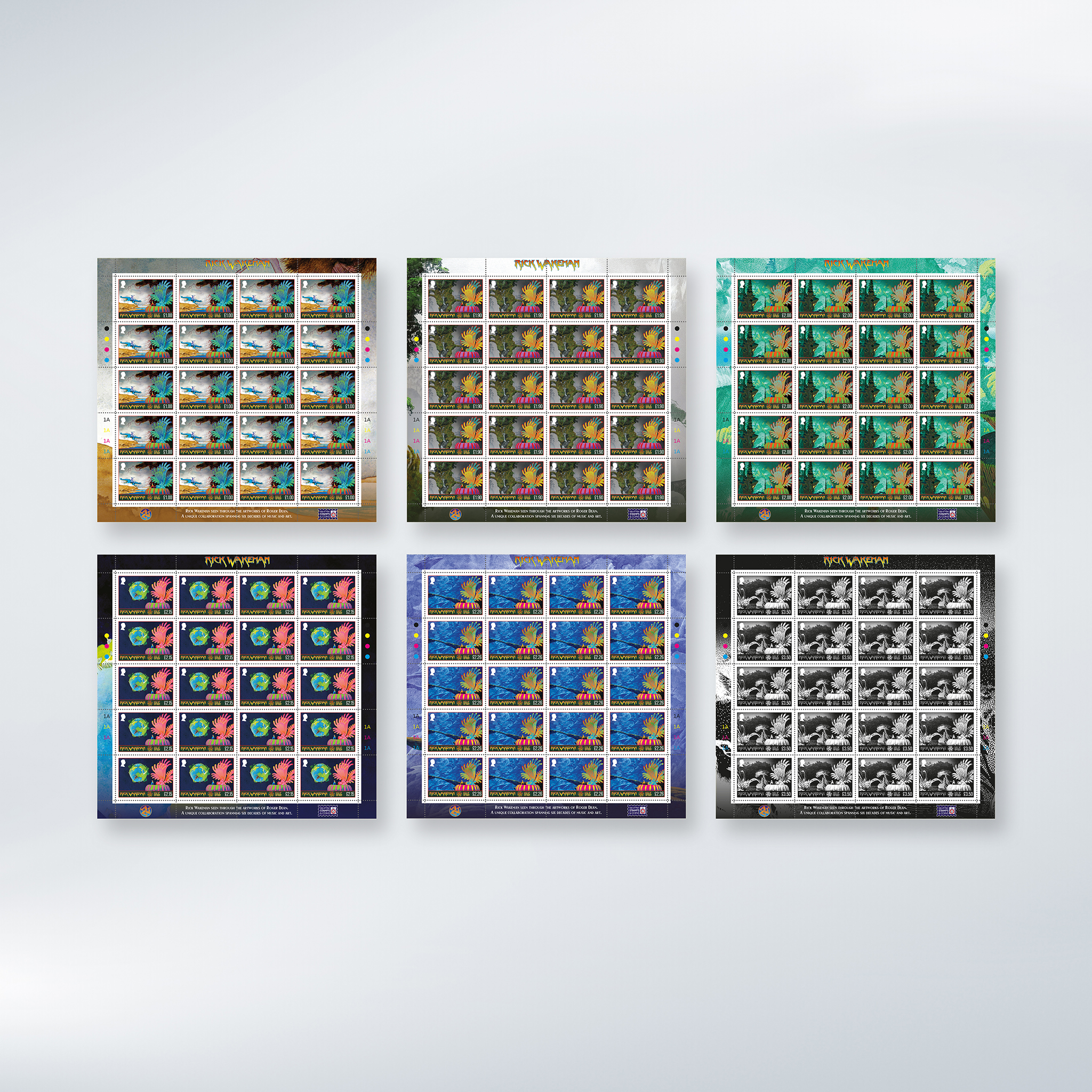 Two giants of progressive rock have come together in a landmark collection of six stamps celebrating the legendary keyboard wizard Rick Wakeman, brought to life through the visionary artwork of Roger Dean.