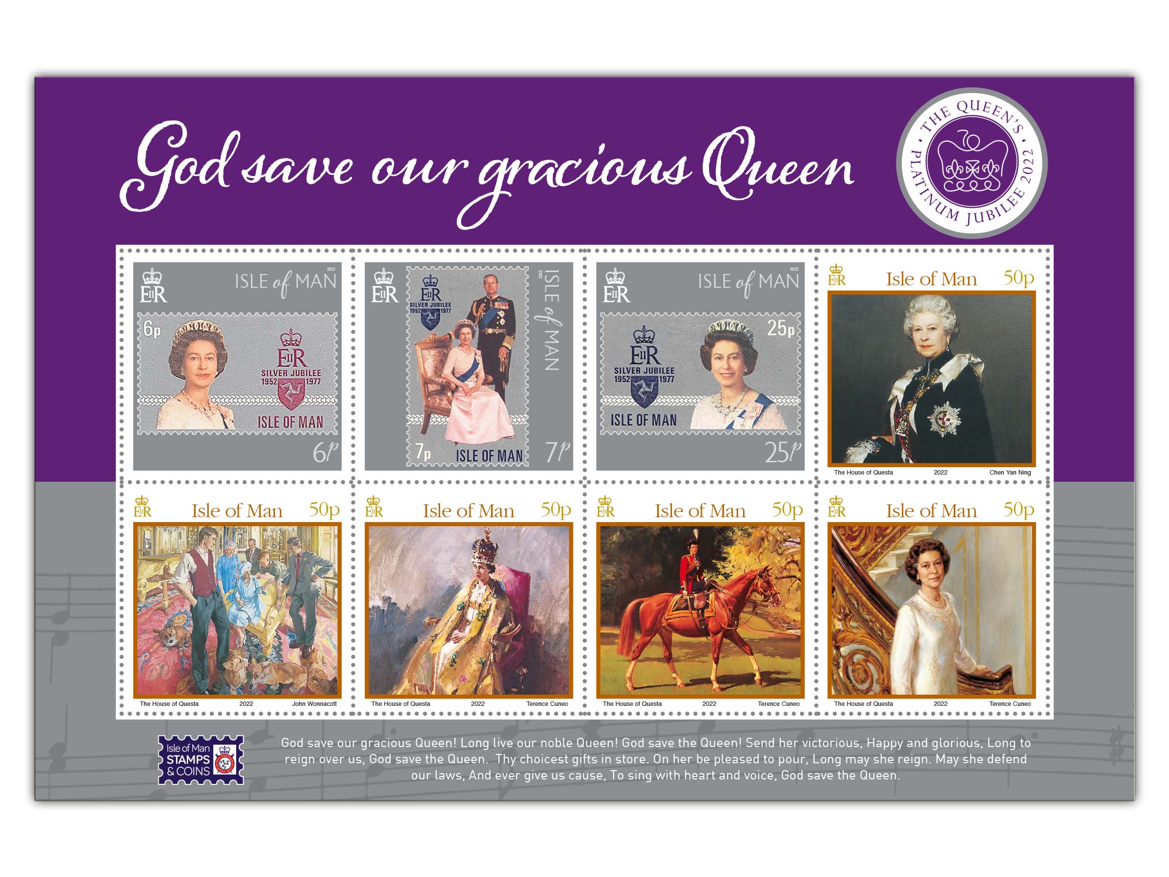 The issue features photographic images from across Her Majesty's reign and includes words from the Royal anthem, God Save the Queen, across both the designs of the stamps and the stamp borders.