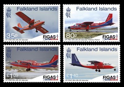 The Islander aircraft depicted on the first day cover, registration VP-FBD, is the oldest in the fleet at 38 years in operation; the aircraft has logged over 19,800 flight hours and 48,500 landings.